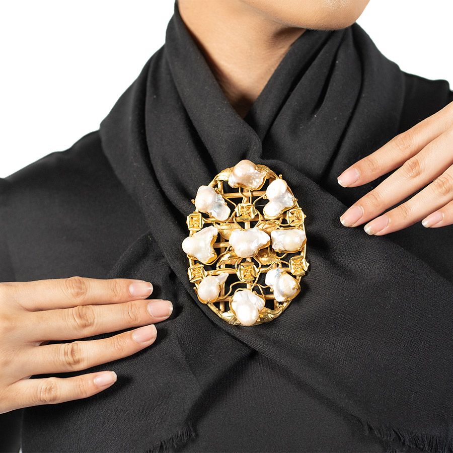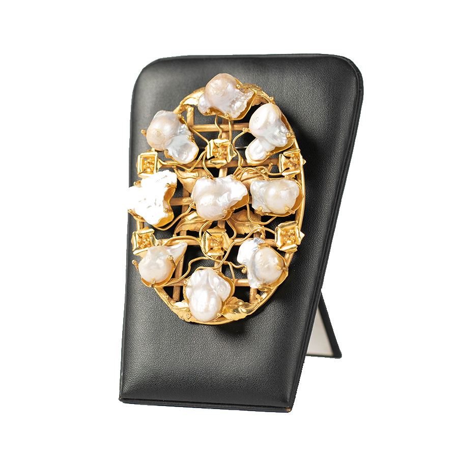 Mutiara barok yg dibingkai dengan bentuk oval dengan full mutiara barok dihiasi dengan motif daun melati. Setiap barang akan memiliki ciri khas masing masing sesuai dengan bentuk mutiara