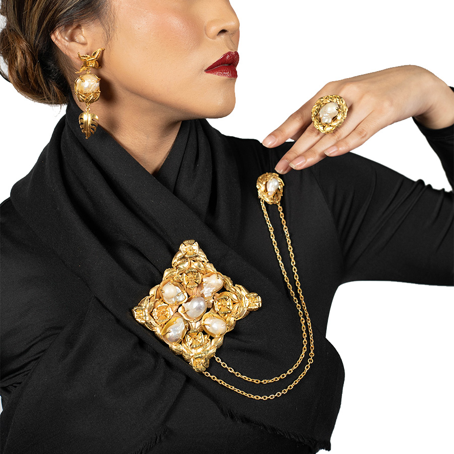 Mutiara barok yg dibingkai dengan bentuk persegi dan ditambah rante mutiara barok dihiasi dengan motif daun dan bunga. Setiap barang akan memiliki ciri khas masing masing sesuai dengan bentuk mutiara