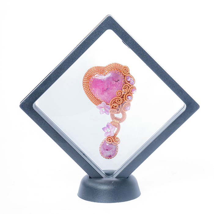 Produk ini dibuat dengan menggunakan batu cabochon yang permukaannya datar yang berbentuk love dibuat dengan aksen penuh yang menyerupai penuh dengan bunga.