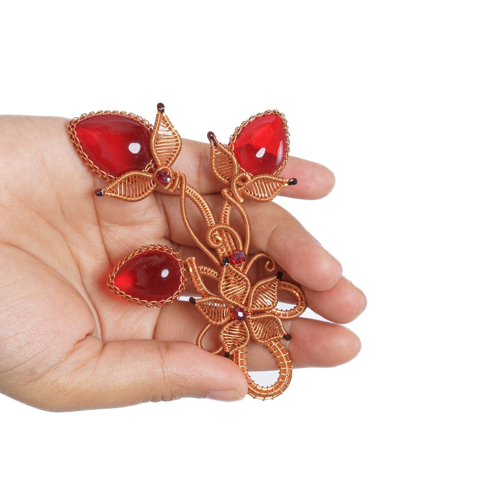 Bros ini menggunakan batu obsidian berwarna merah yang dianyam dengan menggunakan kawat tembaga berenamel jenis rose gold ukuran 0,8 MM dan di padukan dengan kristal