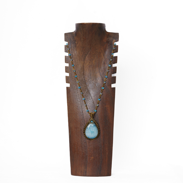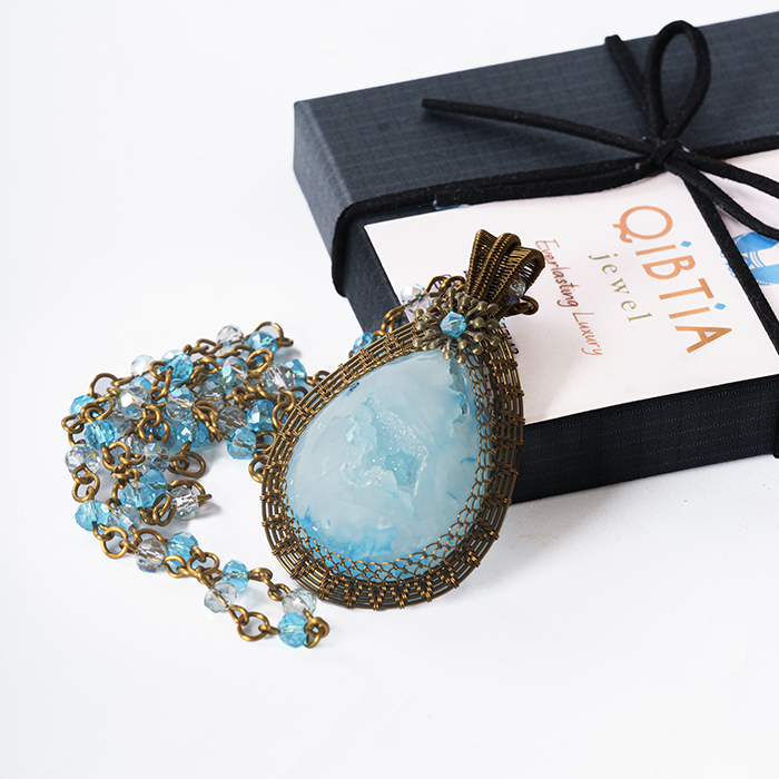 Kalung ini dibuat dengan menggunakan berbahan dasar batu druzzi berwarna biru muda dianyam dengan menggunakan kawat tembaga jenis antique brass yang menghasilkan kesan etnik, unik dan tetap terlihat mewah.