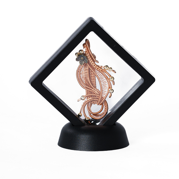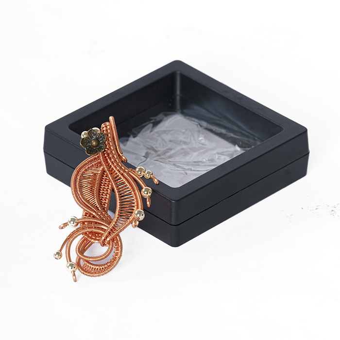 Produk ini menggunakan kawat tembaga enamel jenis rose gold ukuran 0,8 yang dianyam sedemikian rupa, dengan menambahkan bunga tembaga serta manik lada.