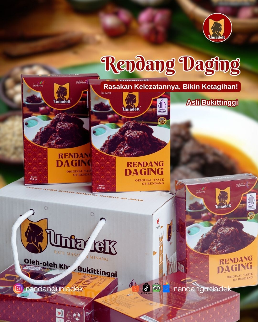 Rendang Uniadek Rendang Uniadek menyajikan rendang khas Sumatera Barat (Bukittinggi) dengan cita rasa autentik dan warna gelap khas hasil pemasakan tradisional selama 13–14 jam. Tersedia berbagai varian rendang dan sambal khas daerah seperti Rendang Daging, Paru, Belut Batusangkar, Lokan Pesisir Selatan, hingga Bebek Cabe Hijau Bukittinggi. Dengan rasa khas, kemasan menarik, dan ketahanan hingga 6 bulan, Rendang Uniadek cocok dijadikan oleh-oleh istimewa dari ranah Minang.