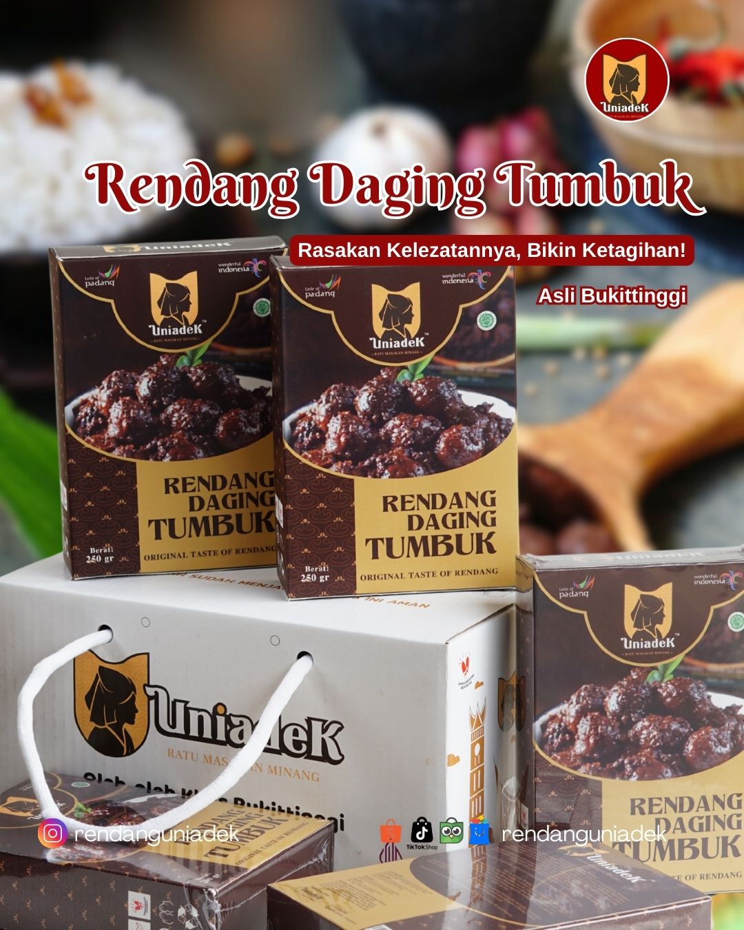 Rendang Uniadek Rendang Uniadek menyajikan rendang khas Sumatera Barat (Bukittinggi) dengan cita rasa autentik dan warna gelap khas hasil pemasakan tradisional selama 13–14 jam. Tersedia berbagai varian rendang dan sambal khas daerah seperti Rendang Daging, Paru, Belut Batusangkar, Lokan Pesisir Selatan, hingga Bebek Cabe Hijau Bukittinggi. Dengan rasa khas, kemasan menarik, dan ketahanan hingga 6 bulan, Rendang Uniadek cocok dijadikan oleh-oleh istimewa dari ranah Minang.