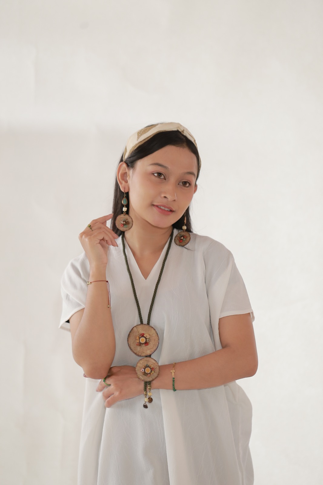 Kalung ini terbuat Dari mutiara kerang dan dibungkus menggunakan kwat tembaga yang dianyam menggunakan tangan dengan sedemikian rupa serta dikombinasi dengan batu ethiopian opal dibagian atas dan mutiara air tawar sebagai rantai kalung menjadi pelengkap kalung ini