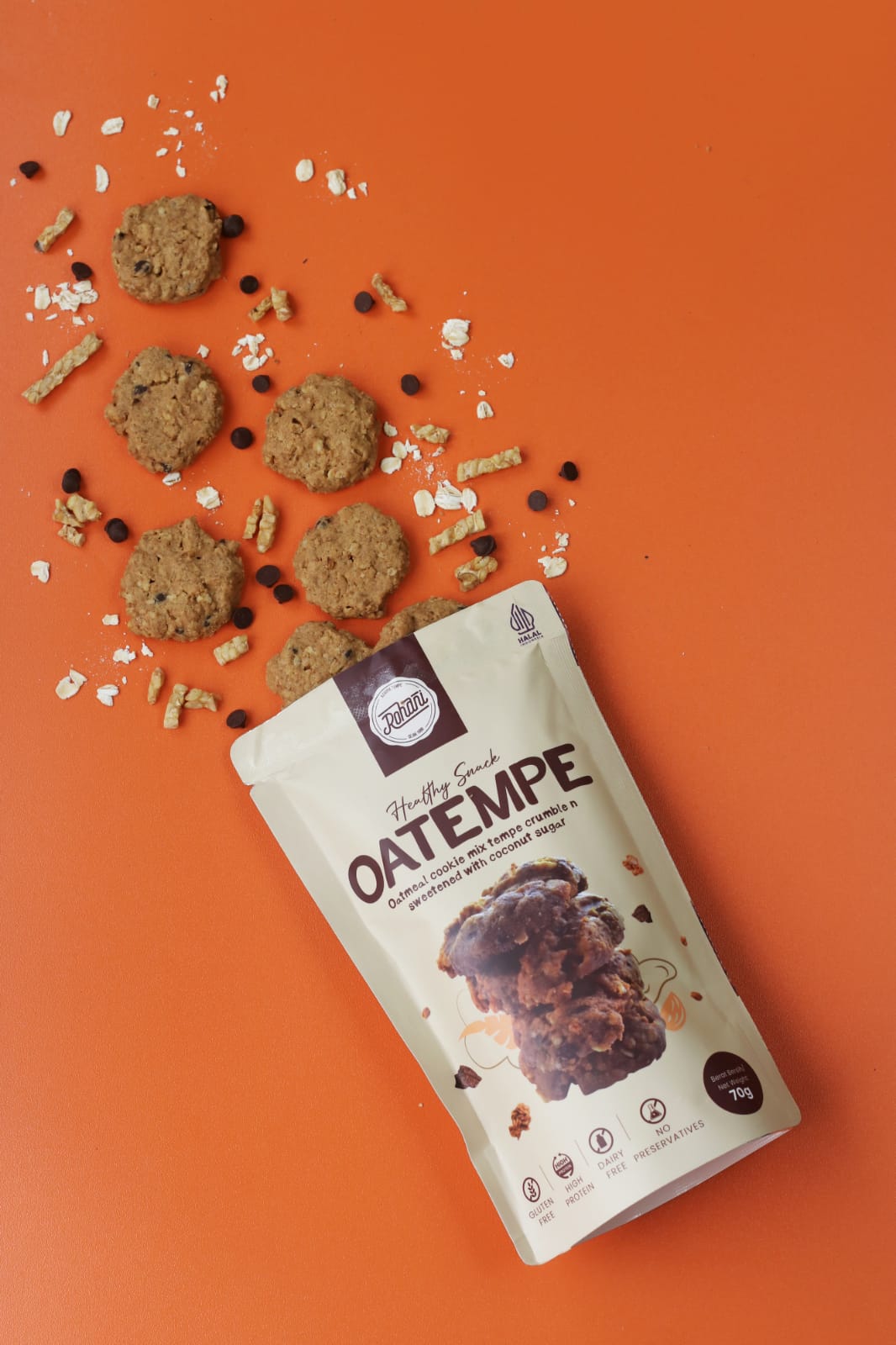 Kandungan Bahan: Tepung mocaf, gula palm, margarin, telur, rolled oat, tempe crumble, chocochips