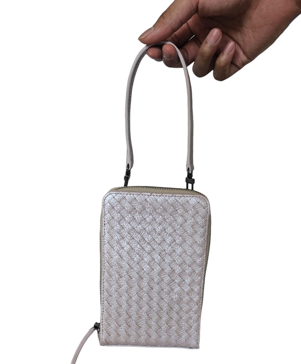 Tas Rukmini, terbuat dari material kulit sapi asli berbentuk anyaman pada bagian depan dengan penutup ritsleting. Bagian dalam menggunakan kain suede, terdapat slip untuk ponsel dan paspor lengkap, dan empat kantung kartu. Dapat digunakan sebagai hand bag untuk perempuan dengan tali kulit lepas pasang.