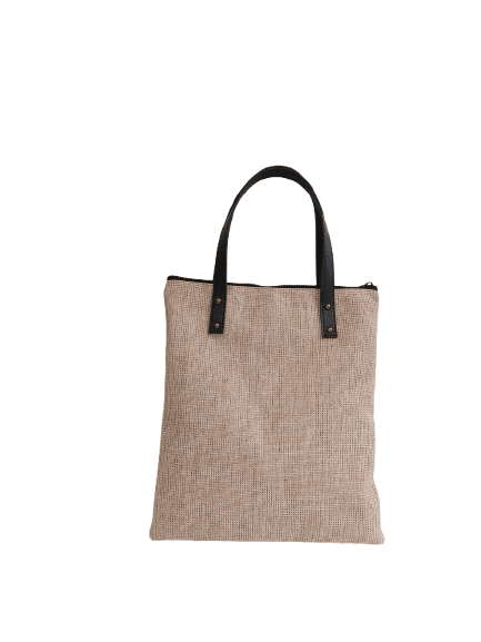 Tote berbahan goni dipadukan dengan kain lurik pada bagian depan dan belakang. Bagian depan disertai logo custom embos. Penutup dengan ritsleting YKK dan dilengkapi handel kulit