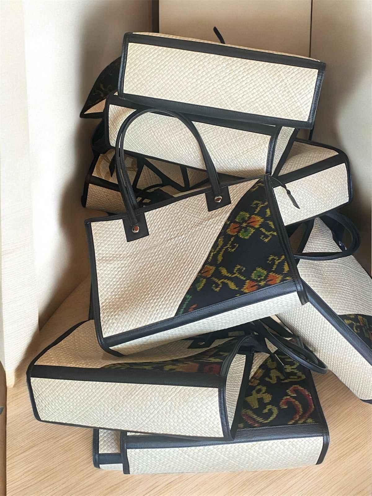 Didesain khusus sebagai kemasan hampers eksklusif, tas ini memadukan sentuhan tradisional Indonesia melalui anyaman alami dan motif kain tenun ikat yang khas.