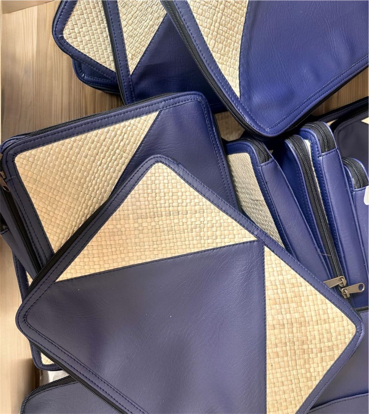 Sleeve laptop dengan sentuhan anyaman alami dan kulit sintetis warna navy. Desain geometris memberi tampilan modern & profesional. Dilengkapi lapisan dalam yang lembut untuk perlindungan maksimal laptop Anda. Ideal untuk aktivitas kerja, meeting, atau sebagai souvenir premium instansi.