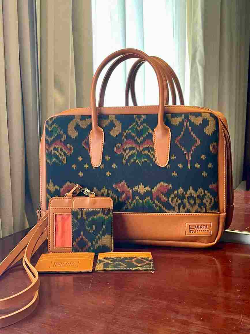 Tas Laptop Eksklusif yang memadukan tenun ikat Nusantara bernuansa klasik dengan kulit sintetis premium warna caramel. Desain ini tak hanya mengutamakan fungsionalitas, tetapi juga menghadirkan estetika budaya yang kuat, menjadikannya pilihan sempurna untuk Anda yang aktif, modern, dan tetap mencintai warisan lokal.