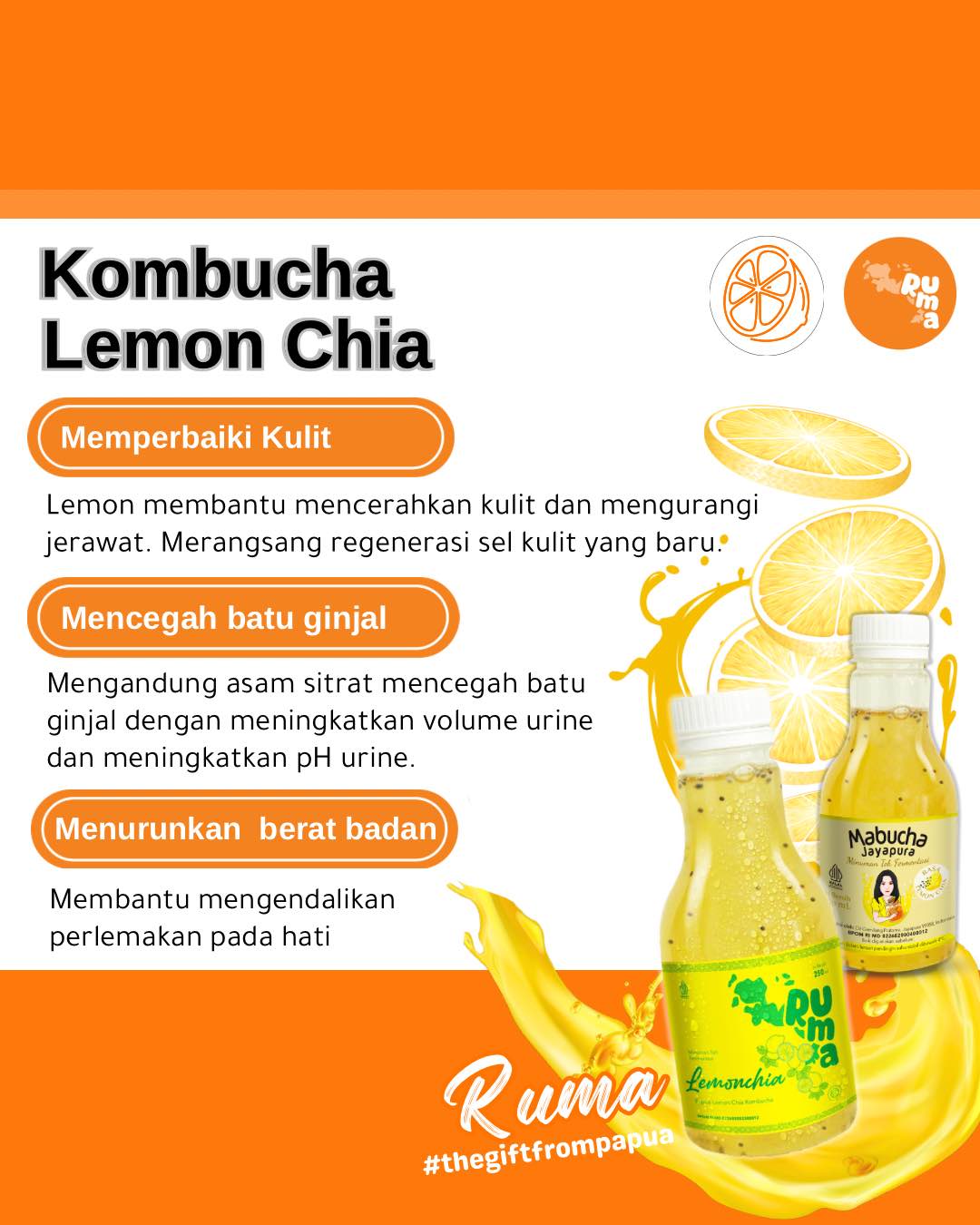 **Mimpi Jadi Nyata** RUMA lahir dari mimpi Dian Lestari, praktisi kesehatan holistik dan ibu tiga anak, yang ingin mendukung perempuan Papua tetap produktif. Dimulai awal 2023 sebagai “Mabucha Jayapura”—Mama buat kombucha dari Jayapura—70% pelanggannya kini adalah perempuan. Kampanye rutin memperkuat komunitas perempuan lokal. Kini hadir di 8 kota besar Papua, didistribusikan ke hampir 100 toko & HoReCa. Di tahun kedua, RUMA menjalani rebranding; “RUMA” berarti rumah—simbol kasih, kekuatan, dan harapan. Logo berbentuk Papua dan warna oranye cerah mencerminkan semangat kami membawa warisan alam & budaya Papua untuk dinikmati kapan saja, di mana saja. **#MenyegarkanIndonesiaDariPapua**