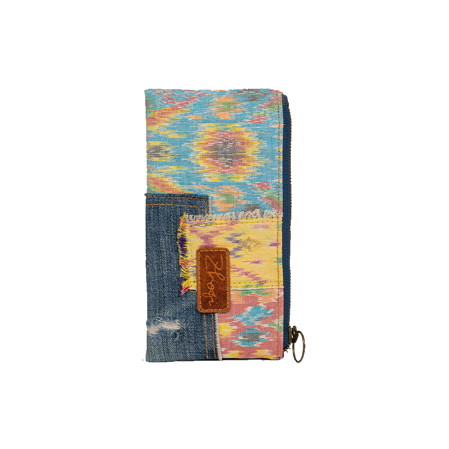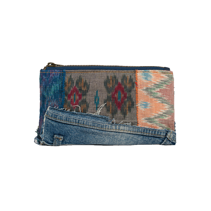 Upcycled terbuat dari patchwork kombinasi kain tenun blongsong dan eks celana jeans