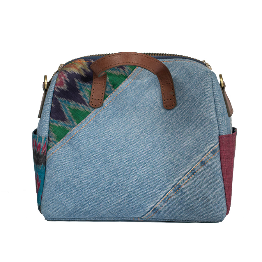 Terbuat dari upcycled celana jeans tidak terpakai dengan aplikasi patchwork dari kain tenun blongsong, bagian dalam terdapat 2 kantong. Dilengkapi dengan handel sling dari webbing polyester tebal dengan aplikasi kulit sapi