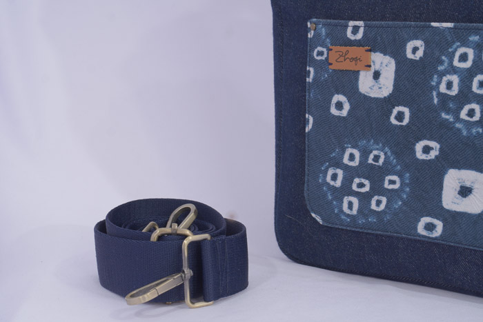 Bagian body tas menggunanakan bahan jeans dan terdapat saku di bagian depan yang terbuat dari kain jumputan Palembang.