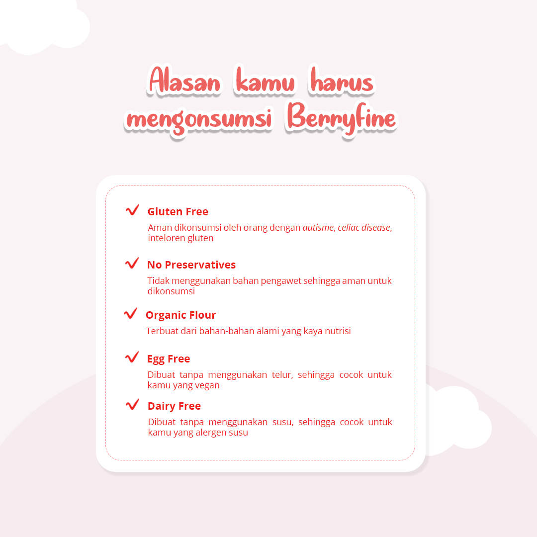 Berryfine adalah cookies sehat yang terbuat dari tepung singkong (Mocaf) organik terbaik dengan paduan kayu manis, biji-bijian, dan buah berry. Cocok dinikmati bersama keluarga. Selamat mencoba!