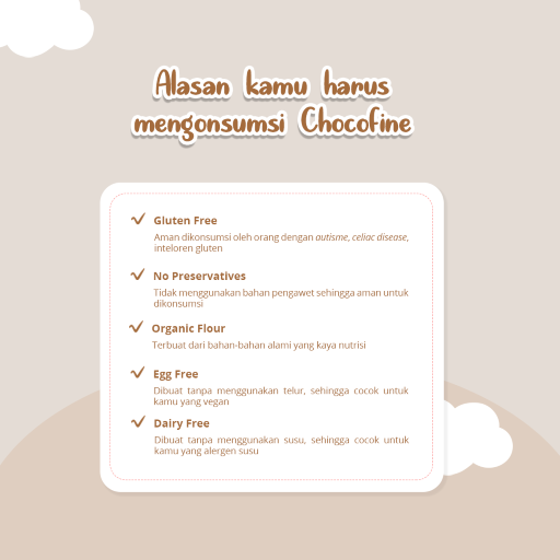 Chocofine adalah cookies sehat yang terbuat dari tepung mocaf organik terbaik. Perpaduan coklat dan topping Almond menjadikan Chocofine ingin dinikmati setiap saat. Cocok dinikmati bersama kopi atau susu. Selamat mencoba!