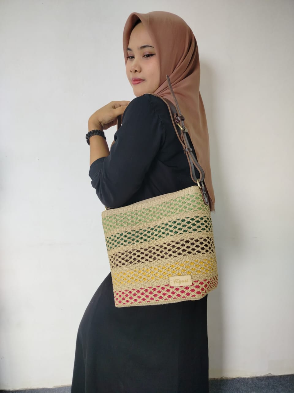 Raja shadow merupakan produk rajut jaring dengan motif bungo lado benang dasar 5 warna dikombinasikan dengan warna alam yang membentuk corak warna unik, menggunakan handle premium kulit sapi asli, cocok dipakai acara resmi untuk wanita aktif.