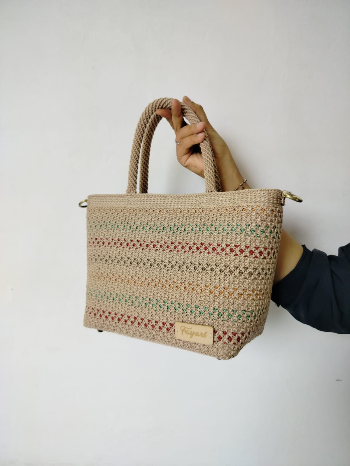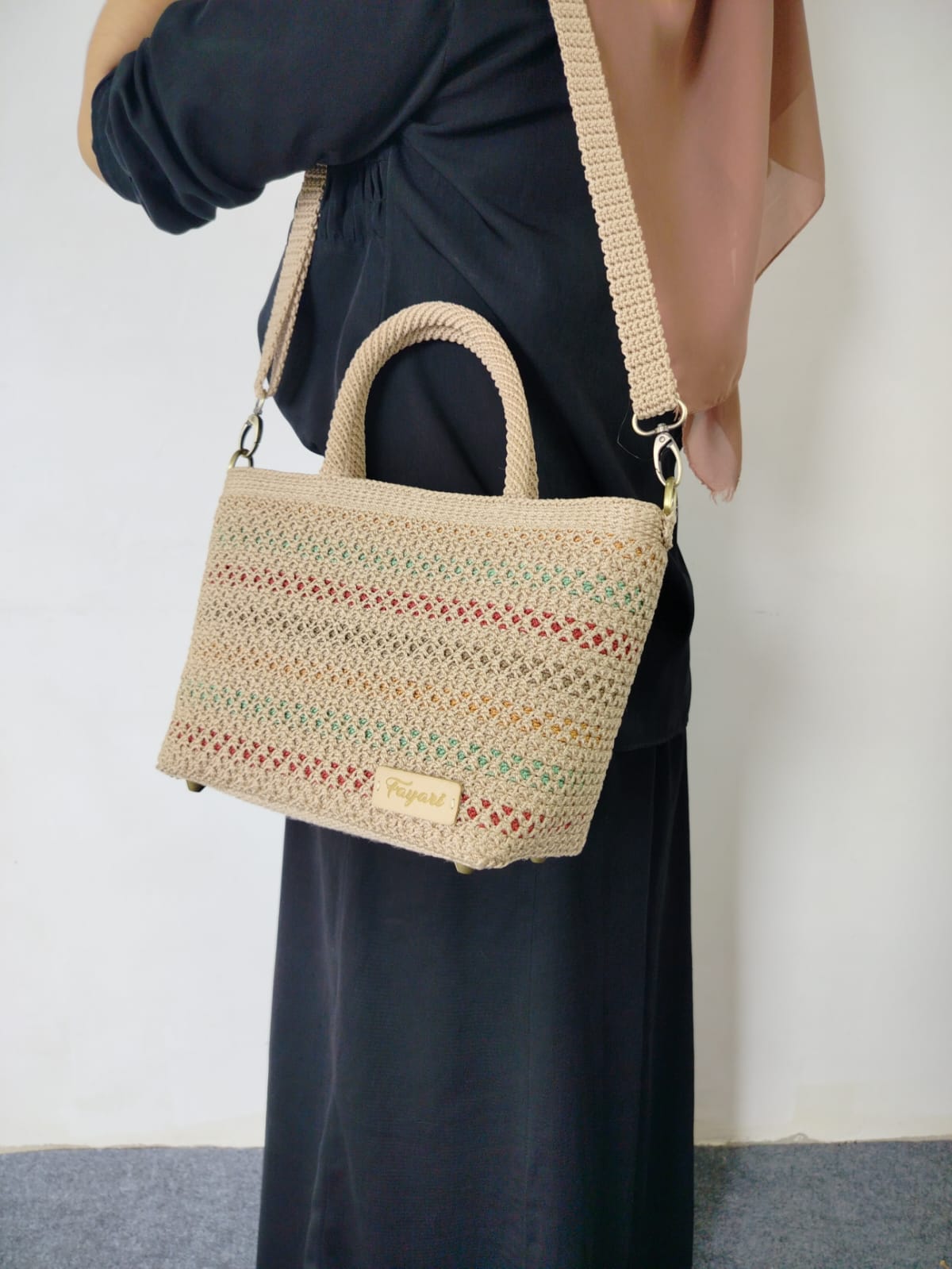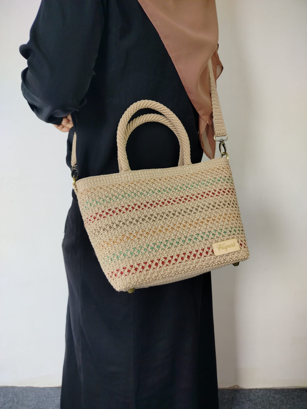 Tas rajut jaring berukuran medium ini siap temani setiap momen spesialmu. Satu tas, sejuta pesona. Handmade, penuh karakter, dan selalu mencuri perhatian. Sentuhan warna warni bagian dalam di balut warna polos bagian luar dalam desain modern, tas rajut ini nggak cuma cantik, tapi juga bermakna. Warna-warni benang jadi simbol gaya hidup kreatif dan berkelas. dipercantik dengan handle tenteng dan tali panjang yang bisa diatur. Inner suede bagian dalam dilengkapi dengan saku kecil.