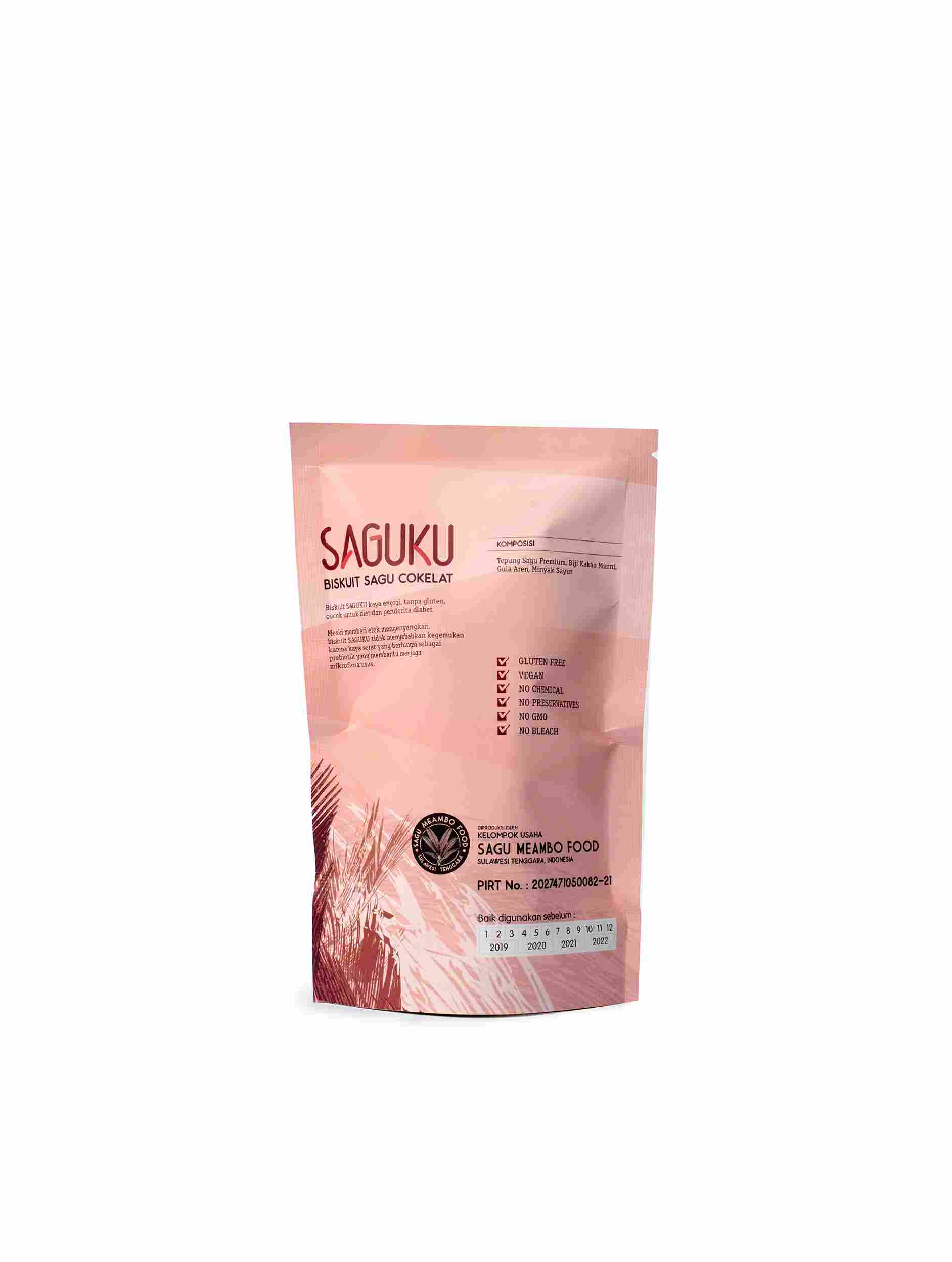 Sagumi Biskuit Sagu Cokelat, kaya energi, tanpa gluten, cocok untuk diet dan penderita diabet. Kaya akan serat yang berfungsi sebagai prebiotik yang membantu menjaga mikroflora usus.