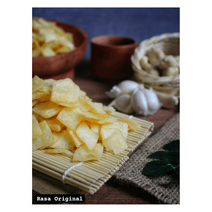 Kripik singkong dengan bite size (potongan kecil2) sehingga mudah dikonsumsi, tersedia berbagai varian rasa yang dikemas dengan kemasan pouch sehingga praktis dibawa untuk camilan di saat bepergian maupun saat santai.