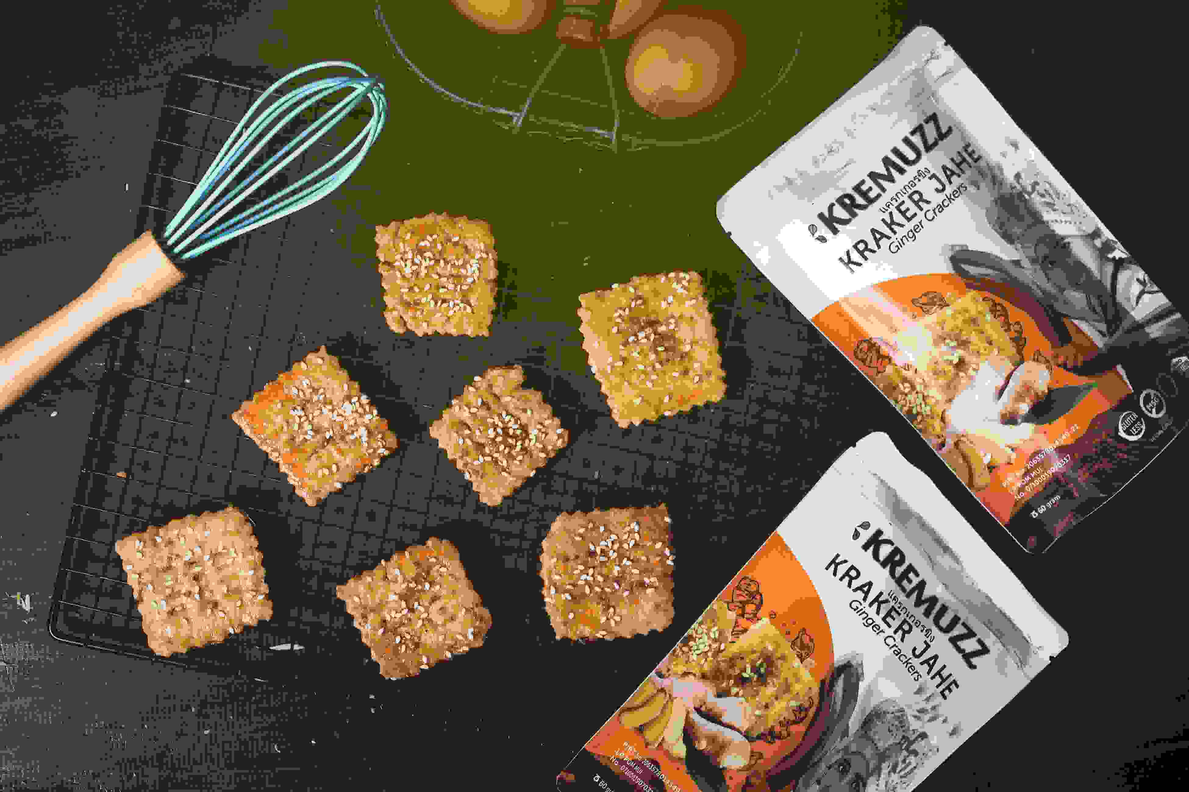 Snack kraker tipis rasa jahe wijen, diproses panggang bukan digoreng, tanpa bahan pengawet, tanpa bahan perisa, tanpa MSG dan rendah gluten. Dibuat dari 100% bahan baku lokal premium.