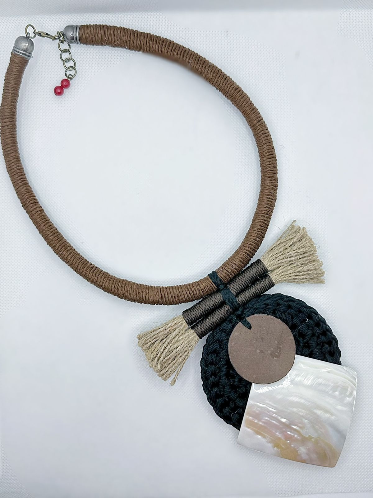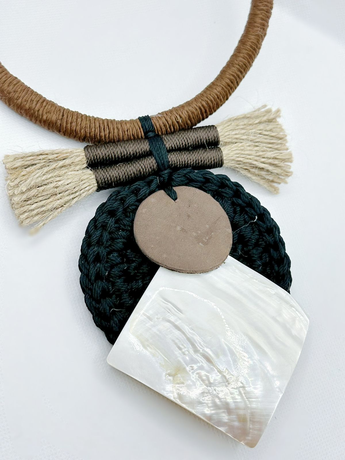 Hadirkan sentuhan alam dalam gaya Anda dengan Kalung Rajut Etnik ini, yang dibuat dengan perpaduan unik antara benang rami alami, kulit, dan kulit kerang. Rajutan rami yang kuat namun ringan menjadi dasar yang sempurna untuk memamerkan kilau alami kulit kerang dan tekstur hangat dari aksen kulit.
