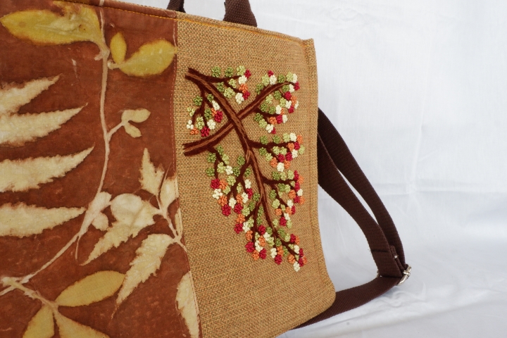 Jenis Bahan: Bahan: Kain serat motif karung: kuat dan bertekstur unik Kain ecoprint: ramah lingkungan dengan motif alami Webbing canvas katun: kokoh dan nyaman