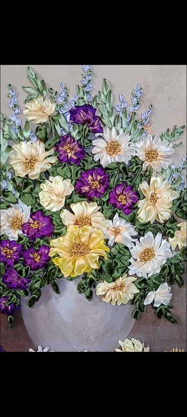 Perpaduan lukisan cat akrilik dan sulam pita di kain kanvas.