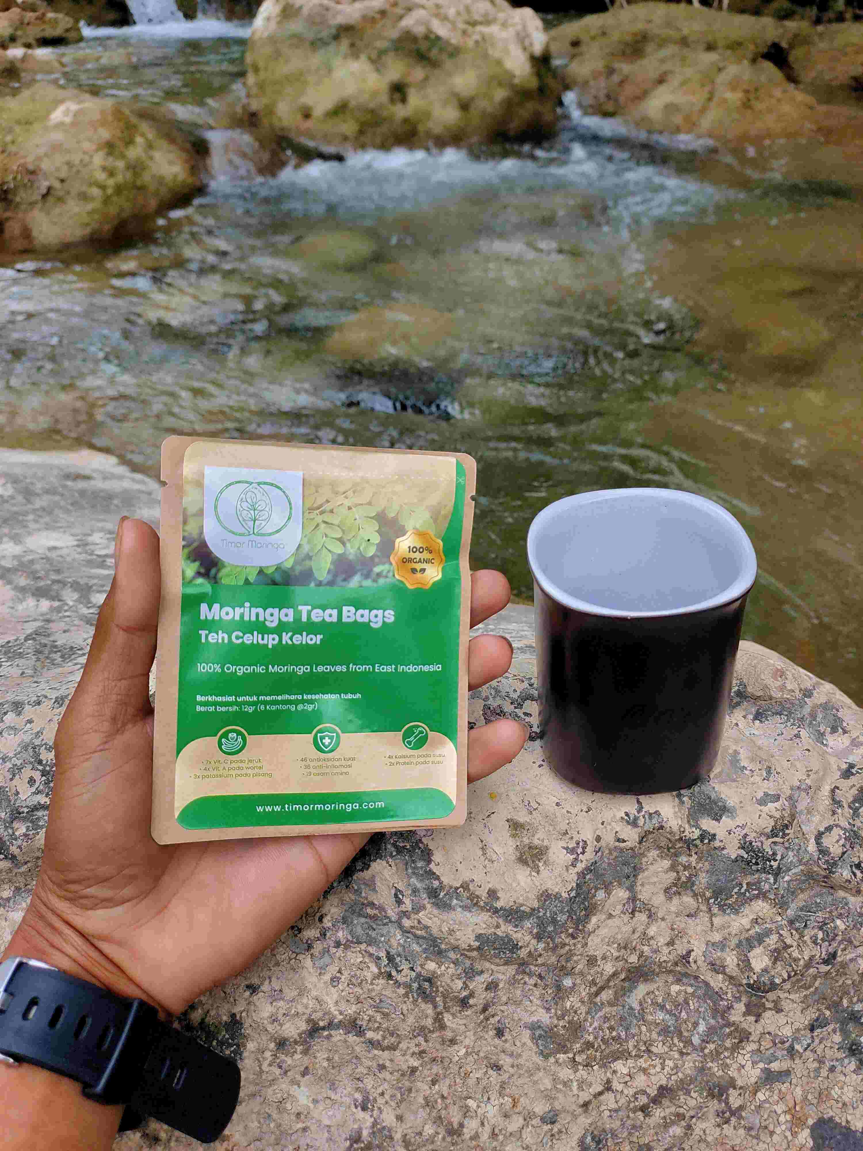 - Teh celup kelor (Moringa tea bags) menggunakan serbuk daun kelor (moringa oleifera) organik dari Nusa Tenggara Timur dengan metode pengeringan berstandar tinggi untuk menjamin keutuhan nutrisi tinggi yang di kandung daun kelor, yaitu :