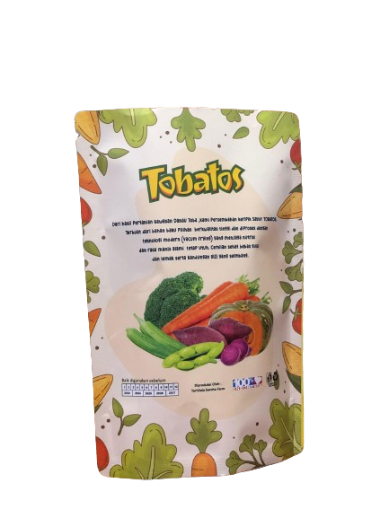 Keripik Sayur Tobatos diproduksi menggunakan bahan dasar sayur yang dihasilkan dari kebun sendiri milik UMKM. Keripik Tobatos sudah tersertifikasi halal.