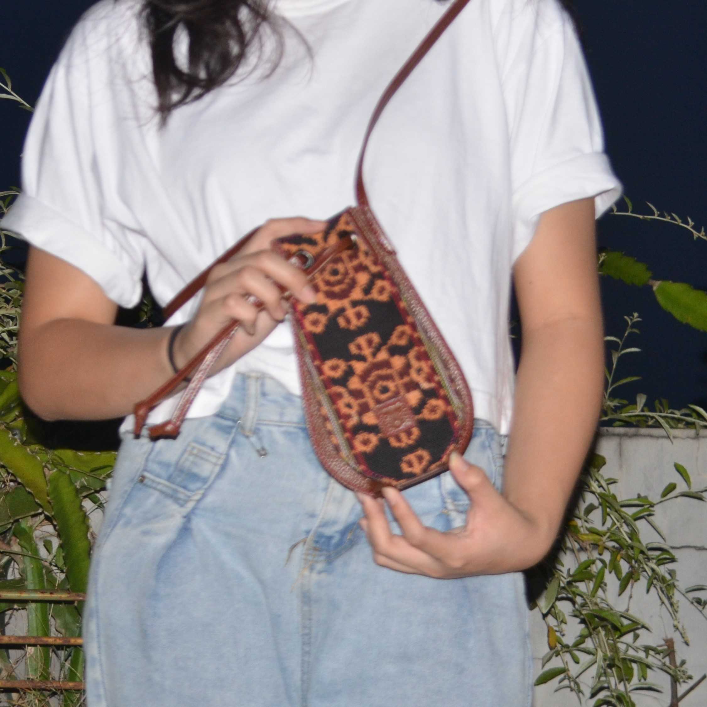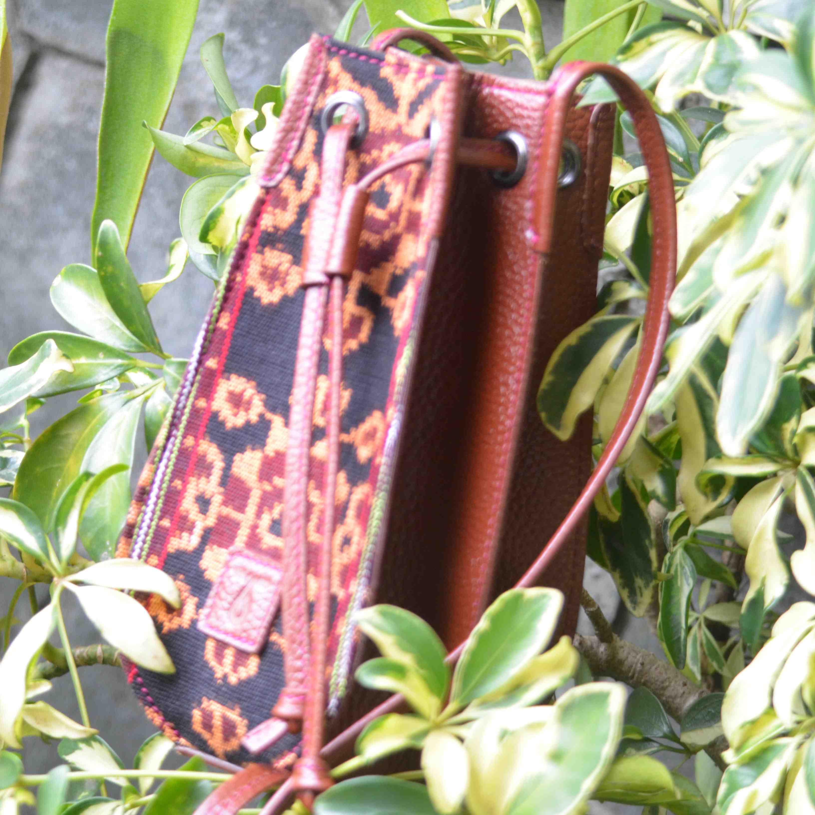 Jenis Bahan: Kulit Sapi dikombinasikan dengan Kain Tenun Nusa Tenggara Timur. (Cow Leather combined with East Nusa Tenggara Woven Fabric)