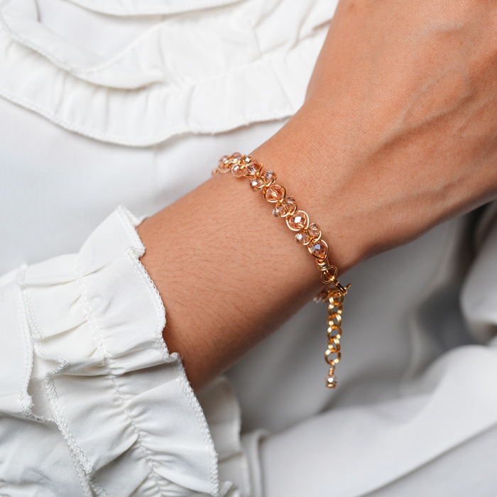 Terinspirasi dari kelopak bunga tulip yang anggun, gelang ini dirangkai dengan lilitan kawat tembaga dan kristal berkilau. Setiap detailnya menciptakan kesan feminin dan manis, menjadikannya aksesori yang cocok untuk melengkapi gaya harian yang lembut, anggun, dan tetap memikat.