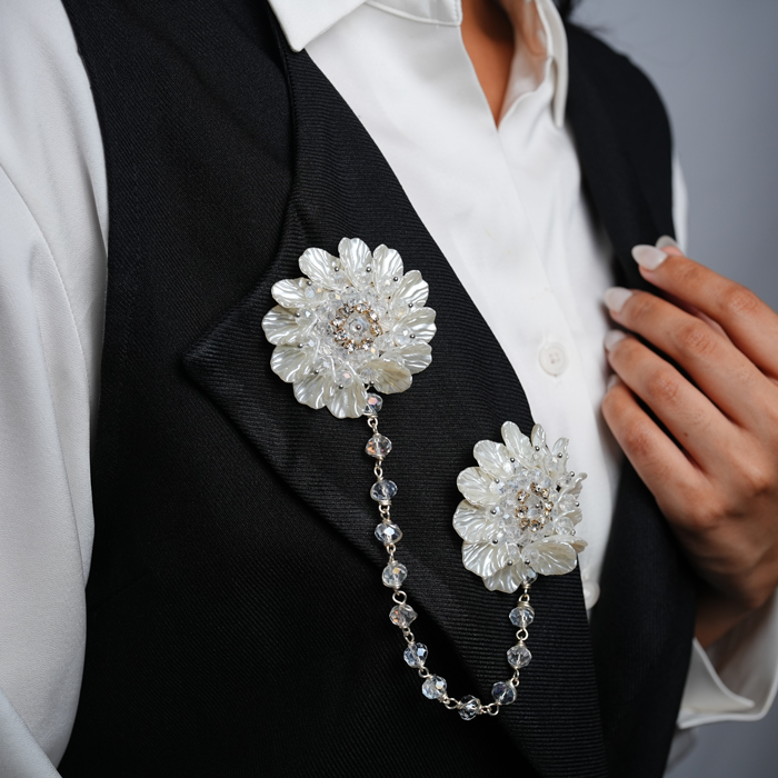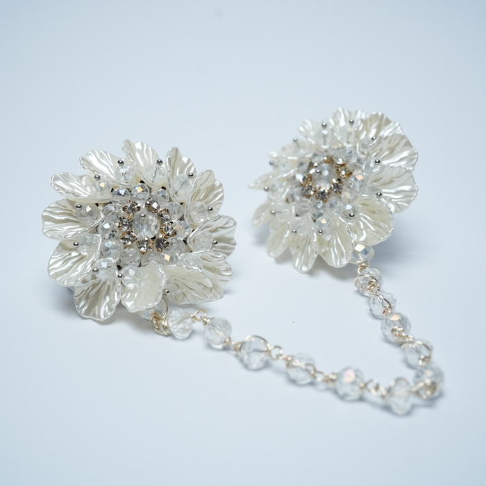 Dua bunga penuh detail dihubungkan oleh rantai kristal berkilau, menciptakan aksen yang tak hanya indah, tapi juga memberi kesan lembut dan berkelas.
