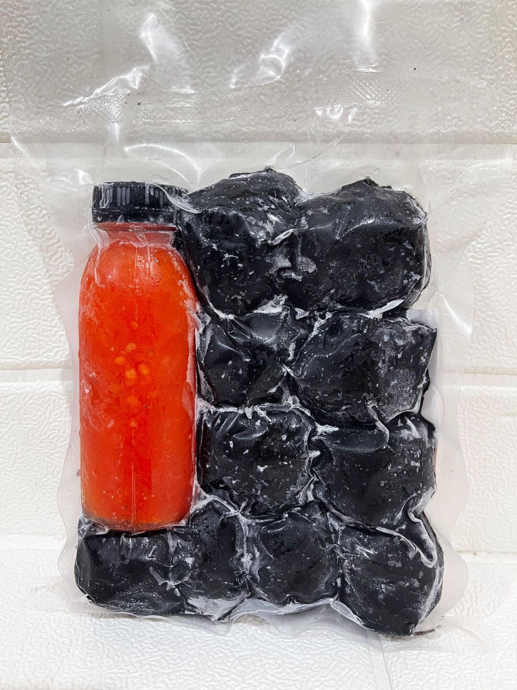 Kandungan Bahan: Daging cumi, tinta cumi, tepung tapioka, dan tambahan bumbu dapur lainnya.