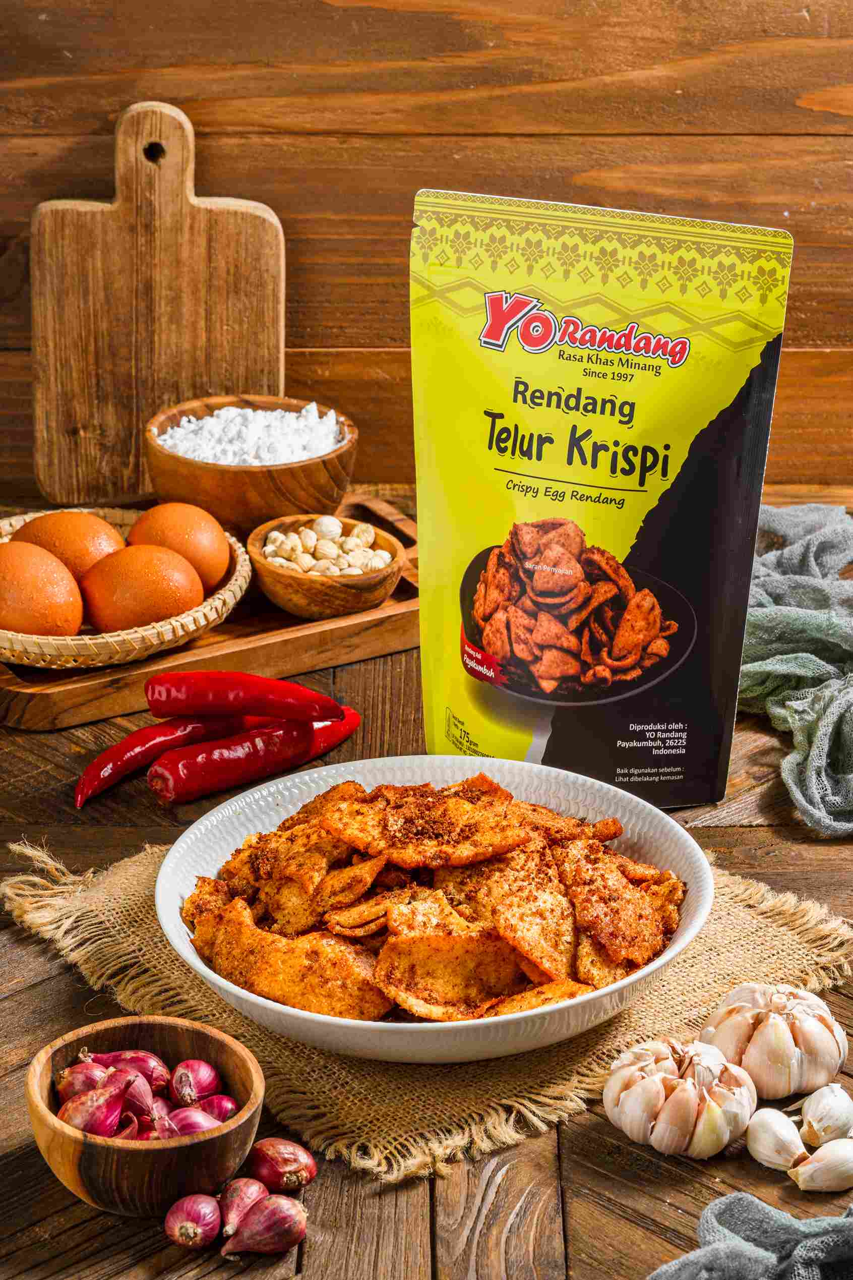 Rendang Telur Merupakan olahan dari telur ayam yang ditambahkan dengan tepung tapioka diaduk menggunakan mixer sehingga menjadi adonan, lalu adonan didadar tipis dan dipotong kecil-kecil kemudian dimasak dengan bumbu rendang hingga kering dan garing.