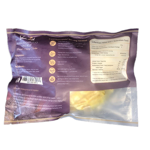 Kandungan Bahan: Daging Ayam Kampung, Air, Bawang Merah, Bawang Putih, Garam, Kunyit, Lengkuas, Jahe, Minyak Goreng Kelapa Sawit, Daun Jeruk Purut, Kemiri, Lada, Ketumbar